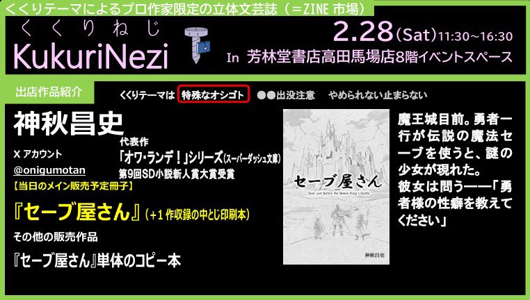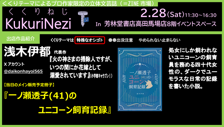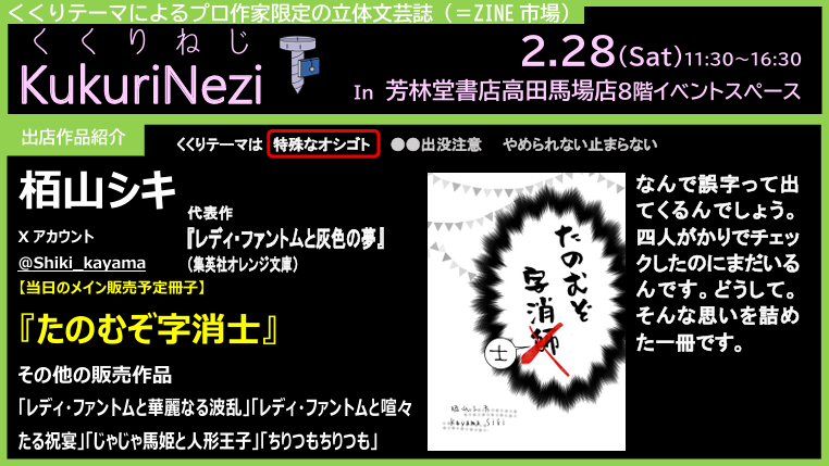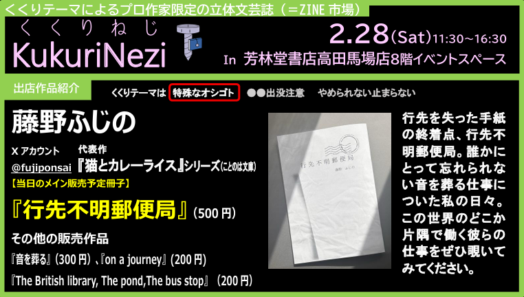 芳林堂書店高田馬場店 山本宛(備考に「2/28イベント事前搬入」と明記して下さい)